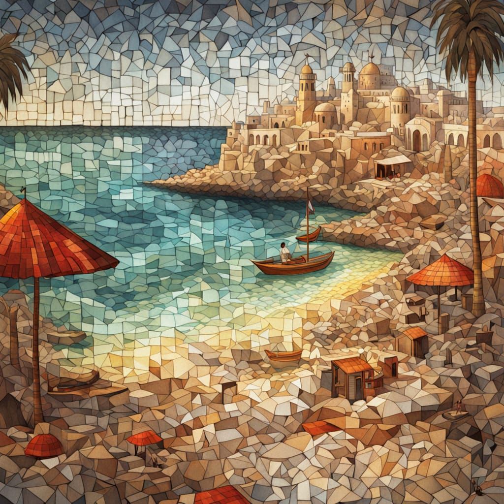 A striking picture of a dark luxury beach scene with people reading. The artwork employs cubism techniques, metallic colors, and a blend of watercolor and acrylic to evoke an ancient Egyptian aesthetic.