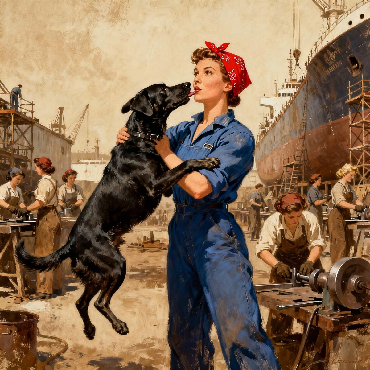 This image depicts Rosie the Riveter sharing a joyful moment with her black Labrador at a bustling shipyard. Other women are actively working in the background.