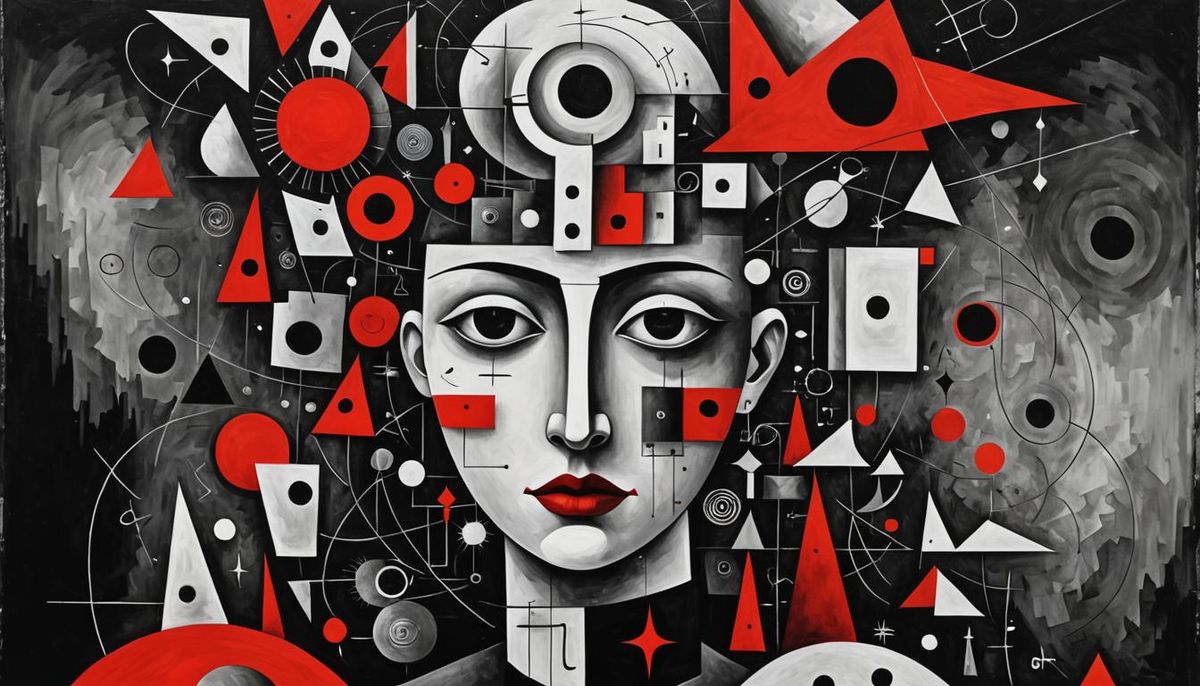 A striking portrait in black, white, and red, showcasing avant-garde cubist surrealism. The artwork evokes a blend of abstract forms and dreamlike imagery.