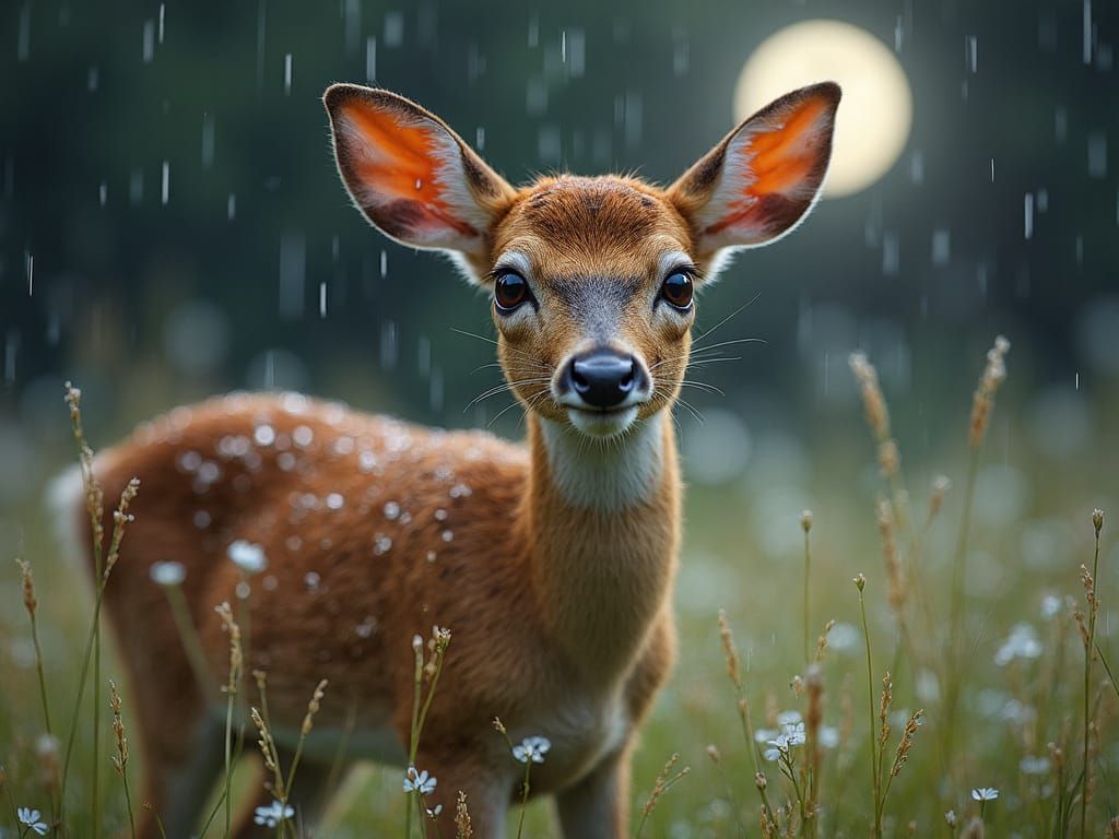 This enchanting image depicts a young deer surrounded by dew-covered grass, bathed in the soft, silvery glow of the full moon. The deer's velvety fur glistens with subtle moisture, and its eyes reflect the gentle light, creating a dreamy, ethereal atmosphere reminiscent of impressionist and wildlife art ...