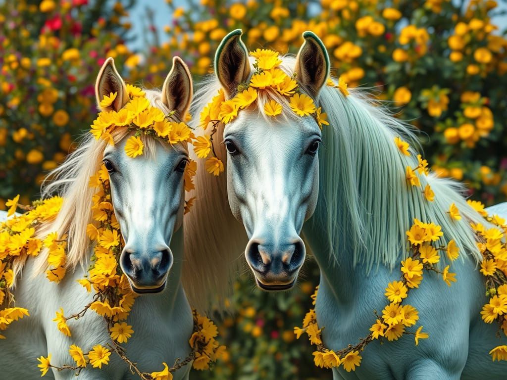 This image shows ponies with coats in cream, light blue, and green, adorned with yellow flowers, against a vibrant background. The scene is rendered with hyperrealism and intricate details.