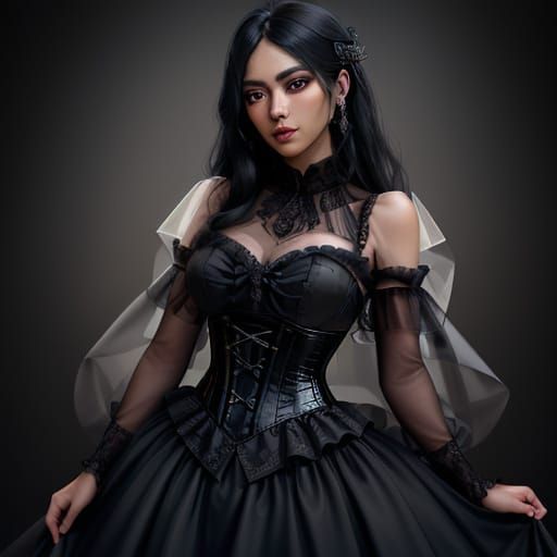 A hauntingly beautiful oil painting portrait of a woman in a sheer black corset, featuring delicate lace and dramatic chiaroscuro lighting against an opulent background.