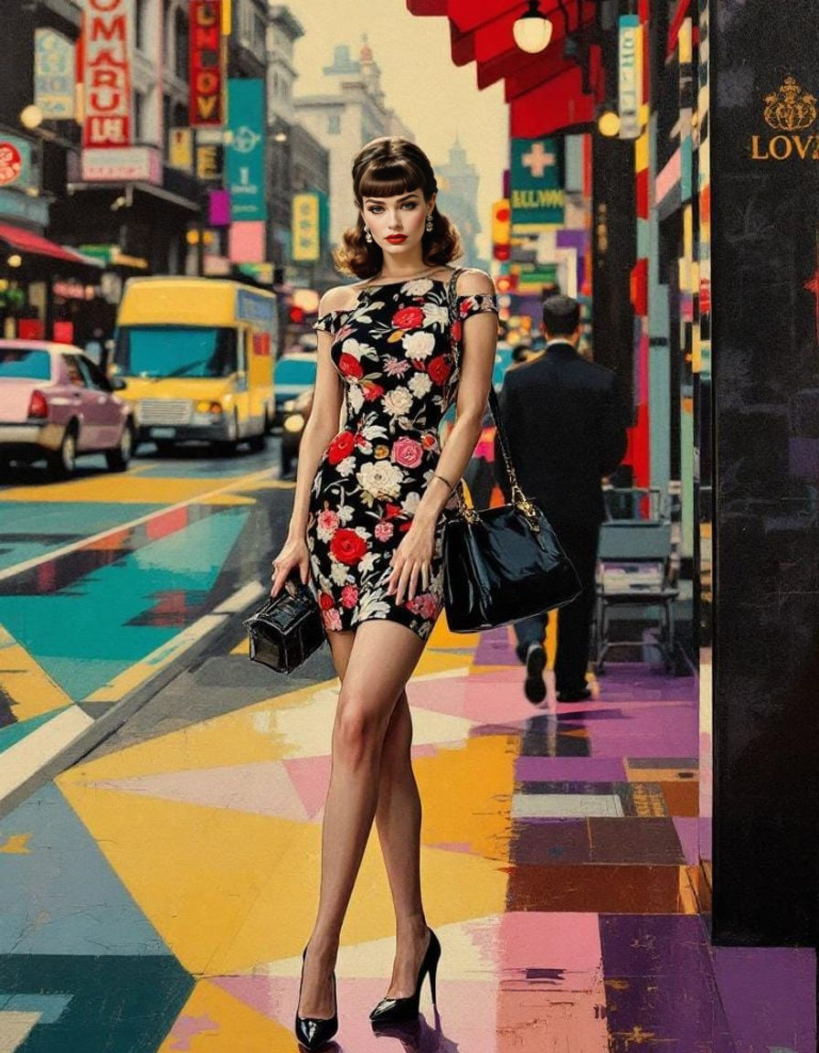 A vivid image of a 1950s pin-up woman on a city sidewalk. The artwork blends baroque lighting and bold pop art colors with geometric Ottoman patterns for a luxurious aesthetic.