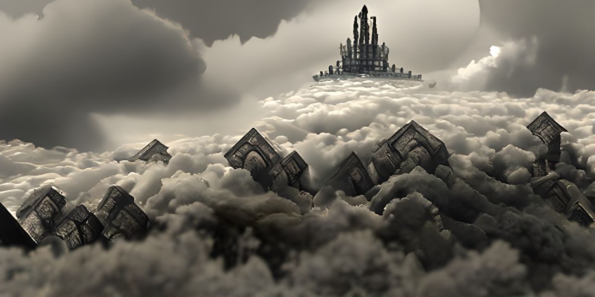 A surreal, ruined city of gods and giants sits atop gloomy clouds. The image, reminiscent of M.C. Escher, showcases an eldritch city in the clouds as concept art.
