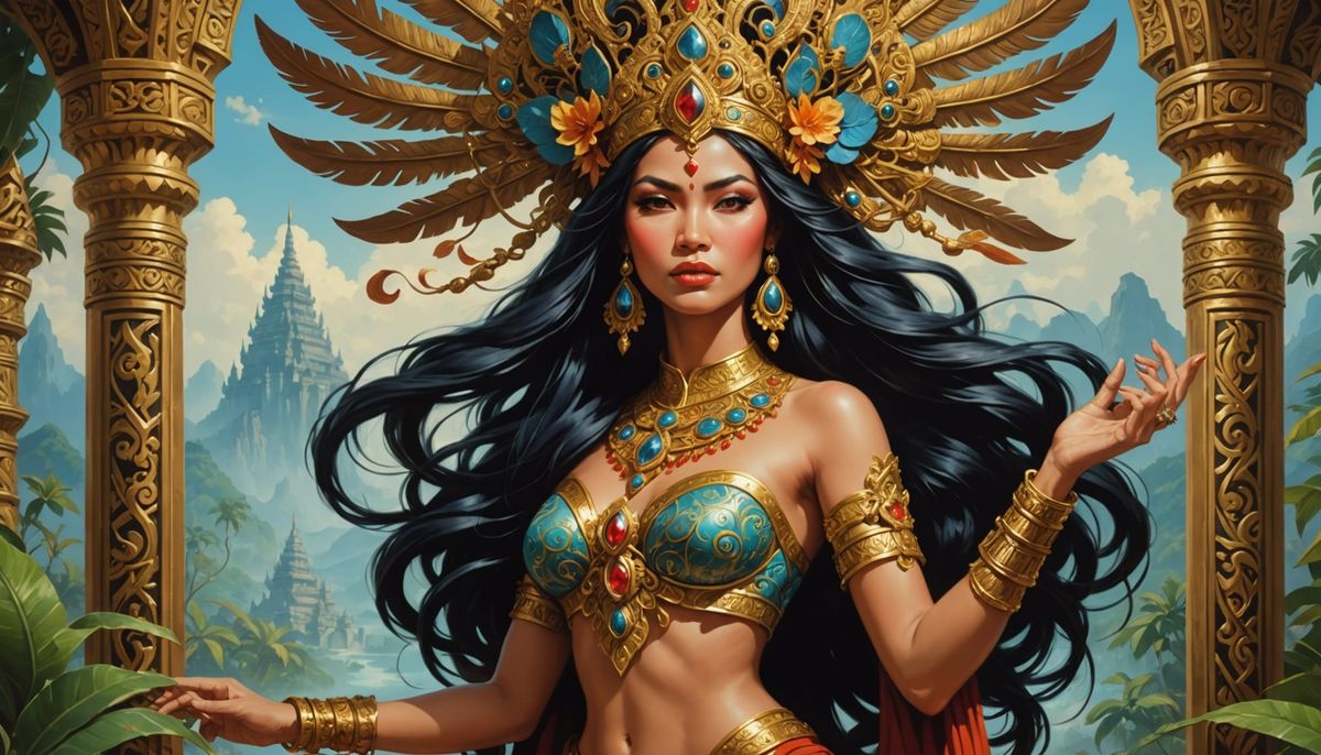 A striking picture of a Southeast Asian priestess in a long shot. The hyperdetailed oil painting is ornate and fantastical, rendered with the vibrant aesthetics of fantasy art.