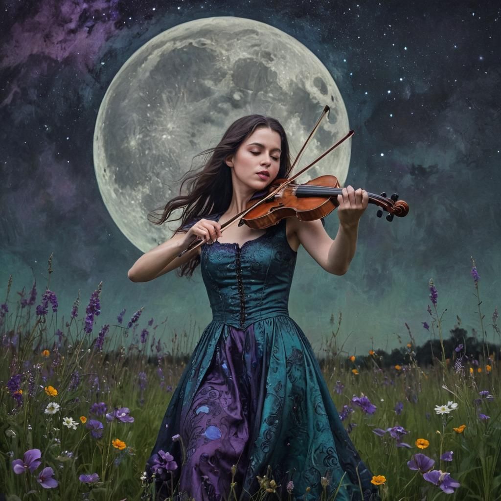 This image shows a woman playing violin in a moonlit meadow under a starry sky. The scene is rendered with bold, textured brushstrokes and intricate details, in an impasto style.