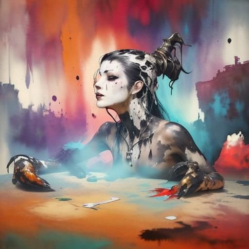 A portrait of a woman with dramatic makeup and obscured eyes. The artwork features a scumbling technique with visible brushstrokes, rendered in watercolors and oil with gothic art influences.