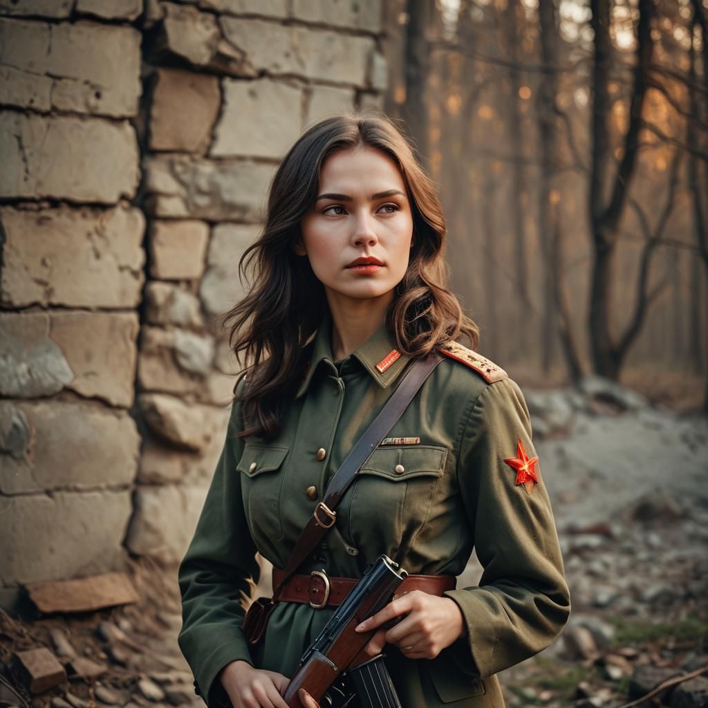 A striking portrait of a woman in a Soviet army uniform holding a rifle. Captured with soft, diffused light and cinematic tones, the image features rich color grading and detailed textures.