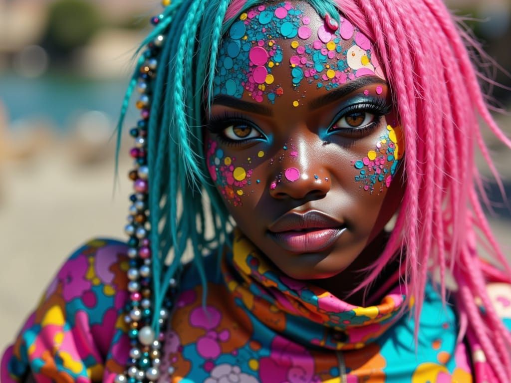 A close-up view of Jimin in a fairycore retro biker style, featuring unusual pastel colors, neon light patterns, and techwear elements.