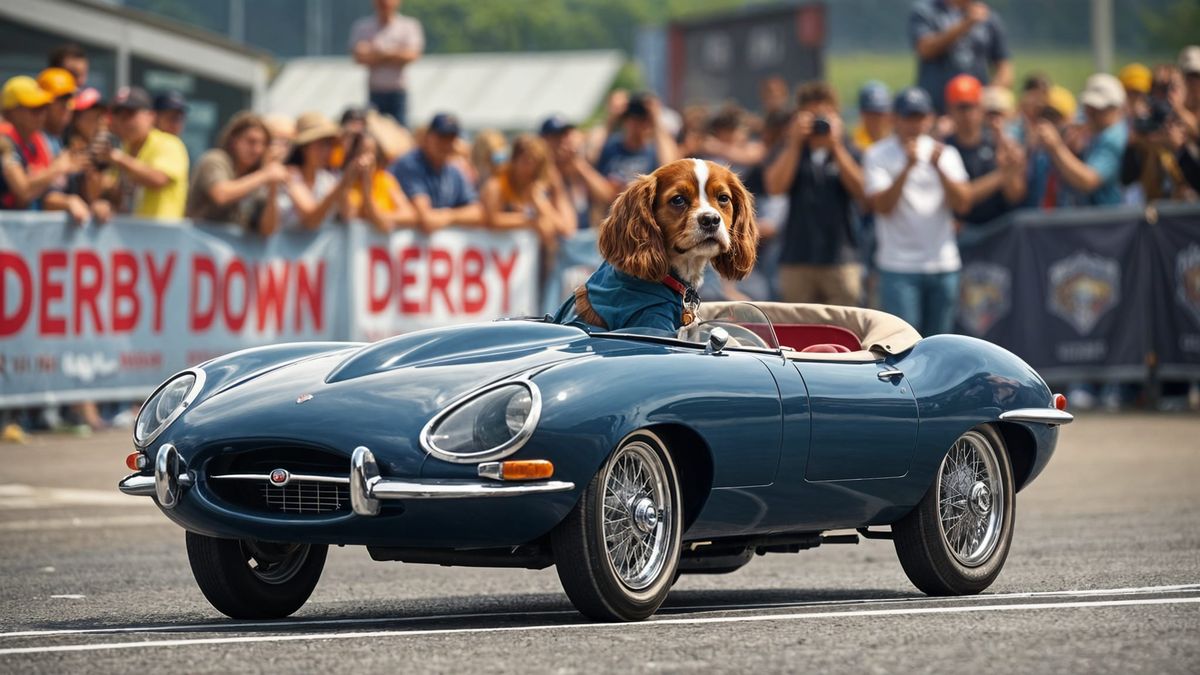 A Blenheim Cavalier King Charles Spaniel in a blue jumpsuit races a miniature Jaguar E-Type Roadster Soapbox Derby car across the finish line. Cheering fans and photographers celebrate in this photorealistic image.