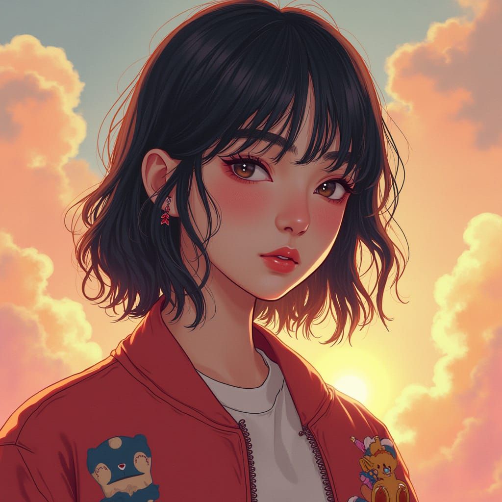 This image shows a young woman wearing a bomber jacket in a style reminiscent of the 1990s. The artwork features whimsical elements and vibrant colors, creating a soft, dreamy atmosphere.
