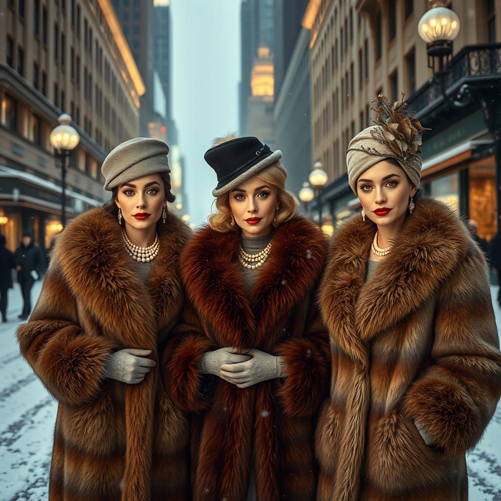 This image shows three women dressed in luxurious fur coats, elegant hats, and pearls, standing in a snow-covered city street surrounded by lavish Art Deco architecture.