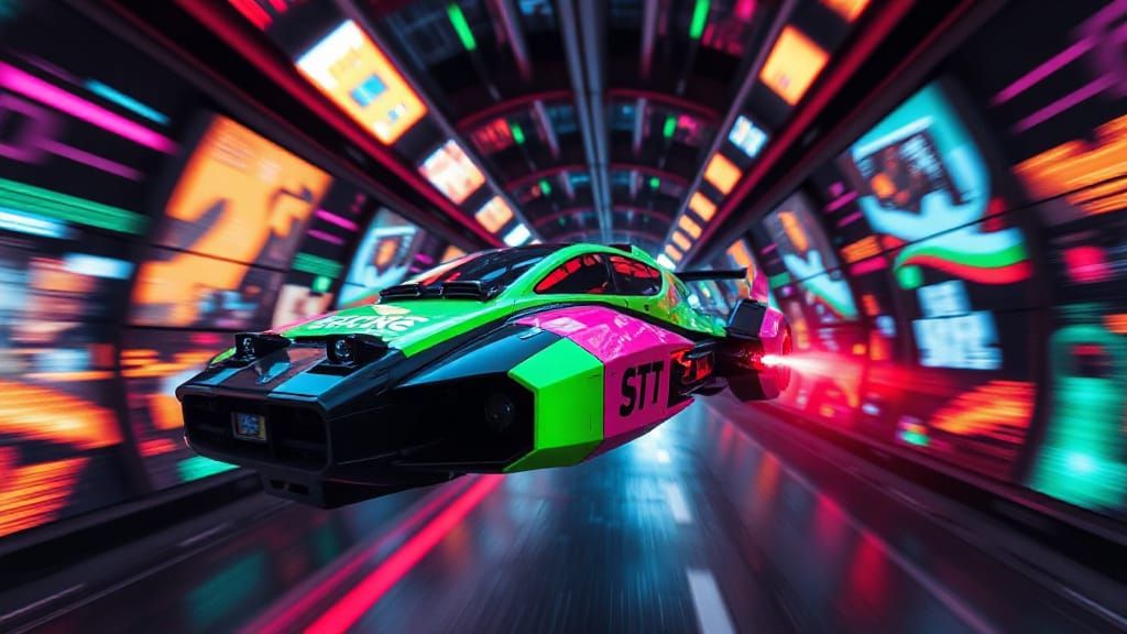 photo photorealistic photographic realism aerial 3D angled close-up photo of a far future multicolour flying floating soaring cyber tech sport hover-speeder with aerodynamicly designed plastic multicolour flourescent and black colour block sections with sporty future logos with chunky lettering with ...