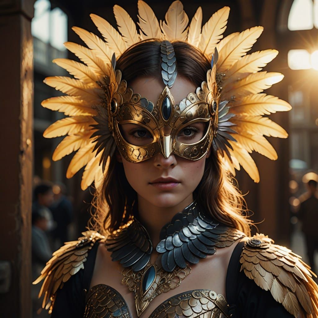 This image shows a young Australian woman in an elaborate seabird costume and mask, captured in a cinematic style. The digital art features glistening feathers and scales, enhanced by soft, warm lighting and a golden hour color palette.