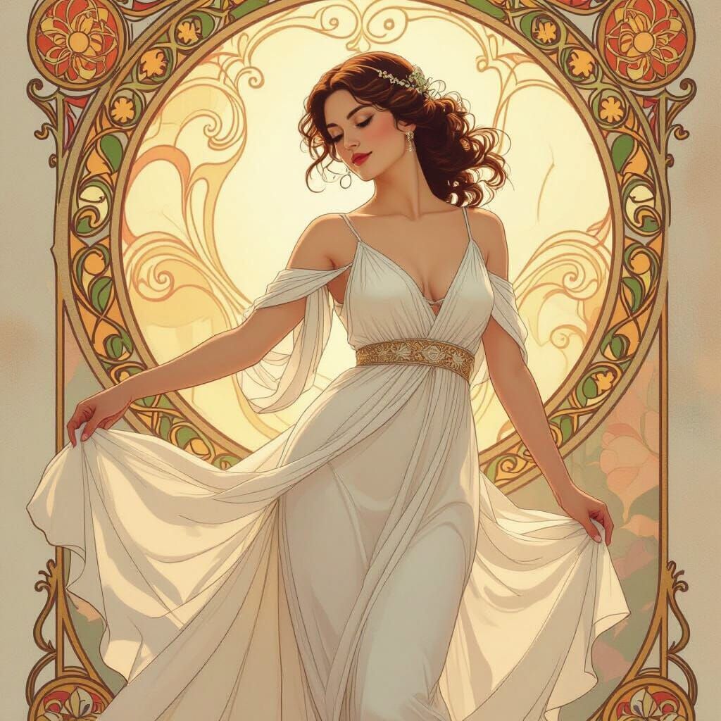 This image shows a woman in a flowing white dress striking an elegant pose. The artwork features delicate lines and vibrant colors in an art nouveau style.