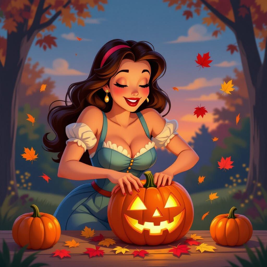 A woman joyfully carves a pumpkin during a cozy autumn evening, with leaves falling. Rendered in a vibrant, classic animation style with dynamic lighting.