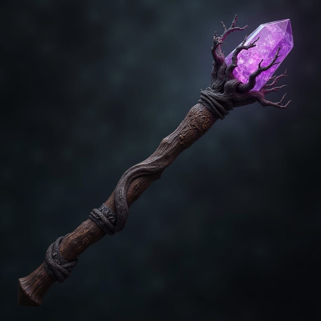 This image shows a dark, mystical wand crafted from ancient deathwood, adorned with intricate runes, a crystal, and fine engravings, radiating an aura of malevolent power and dark history, with a glass-like finish and a deep, rich color palette reminiscent of eerie, mystical art