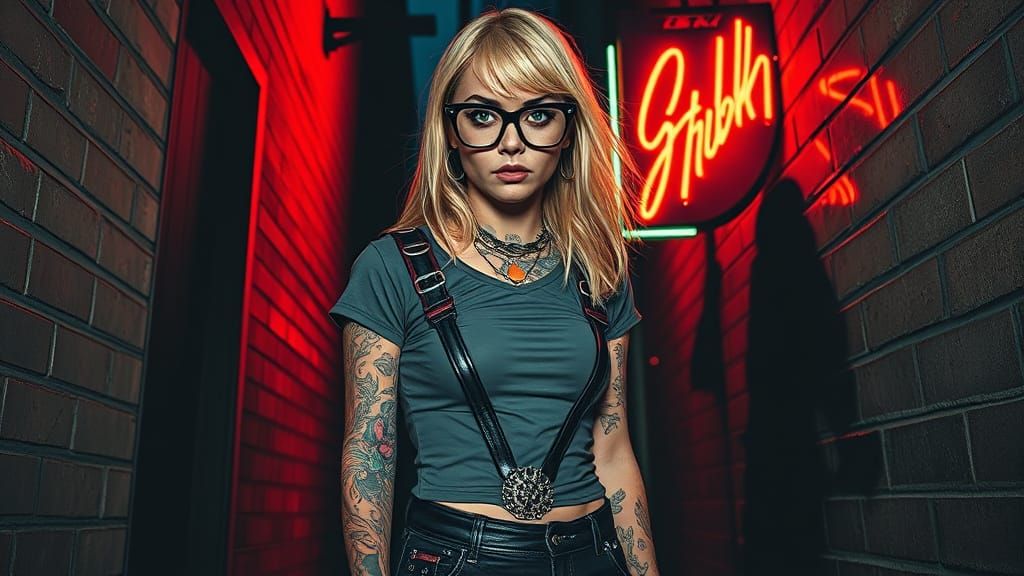This image shows a gothic woman with long blonde hair and striking green eyes in an alleyway. She wears large glasses and ripped clothing, illuminated by neon with a monstrous shadow in a cinematic style.