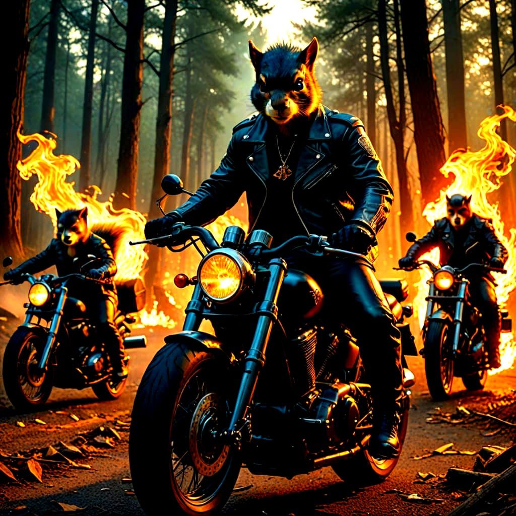 A sinister image of a squirrel motorcycle gang. The composition and lighting create a dark, foreboding atmosphere reminiscent of fantasy art.