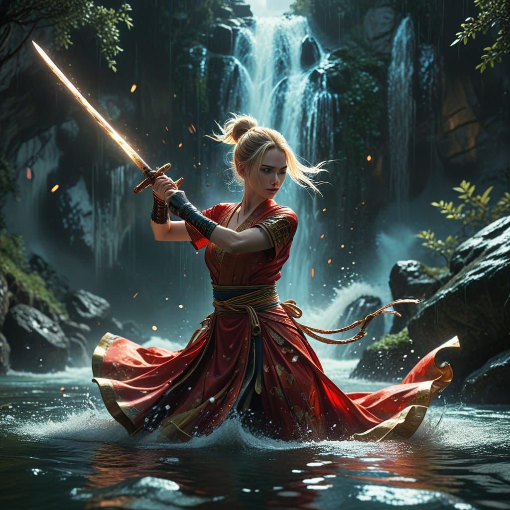 This image shows a young anime warrior standing in shallow water, wielding a glowing katana with lightning effects, set against a lush green backdrop with a waterfall and rocky cliffs. She wears a vibrant red dress with intricate gold patterns and a visible tattoo on her arm, in a dynamic, ethereal scene...