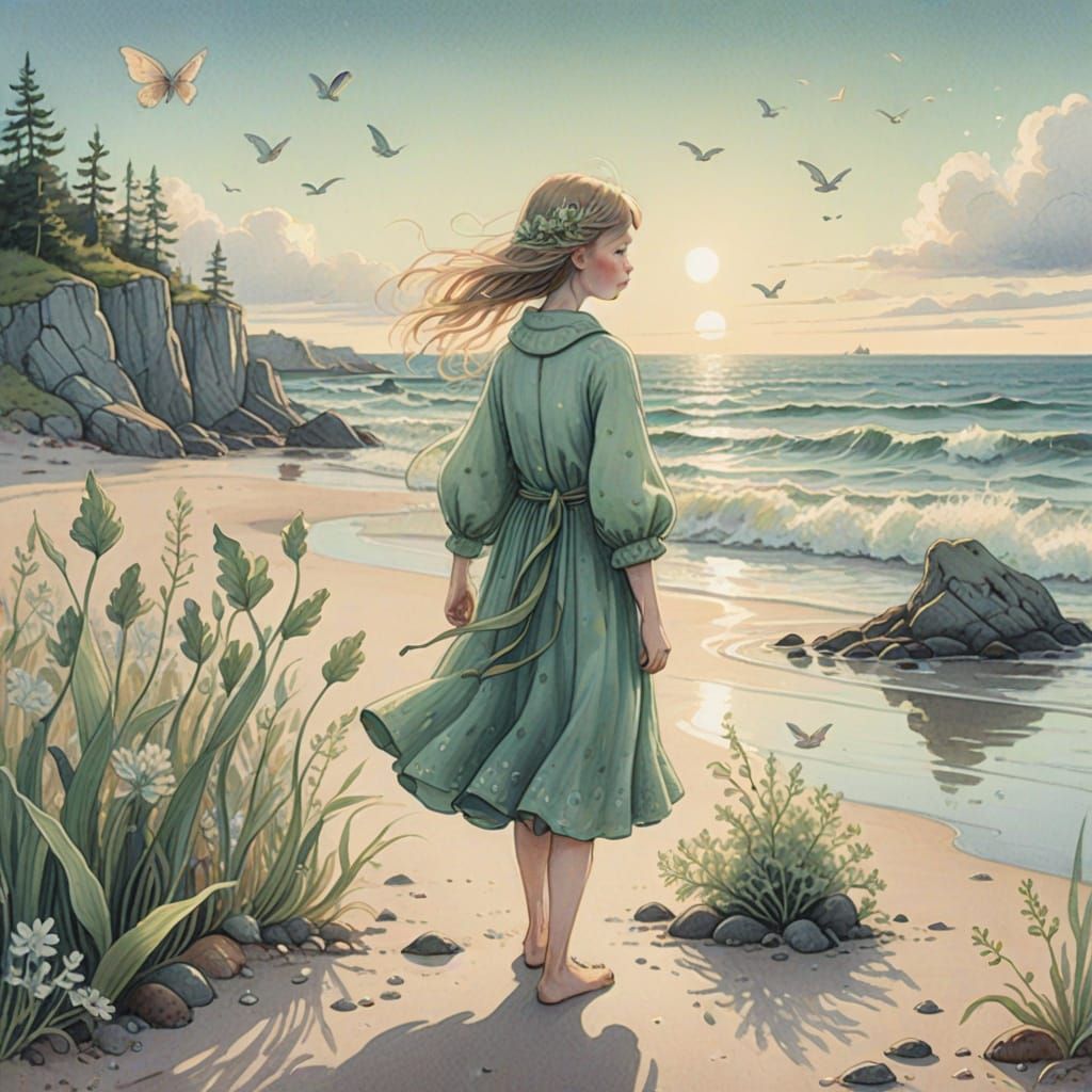 This enchanting illustration captures fantasy creatures delicately collecting seaweed on a serene beach, rendered in soft pastel hues and warm sunlight, with delicate fairy wings and fluffy textures.