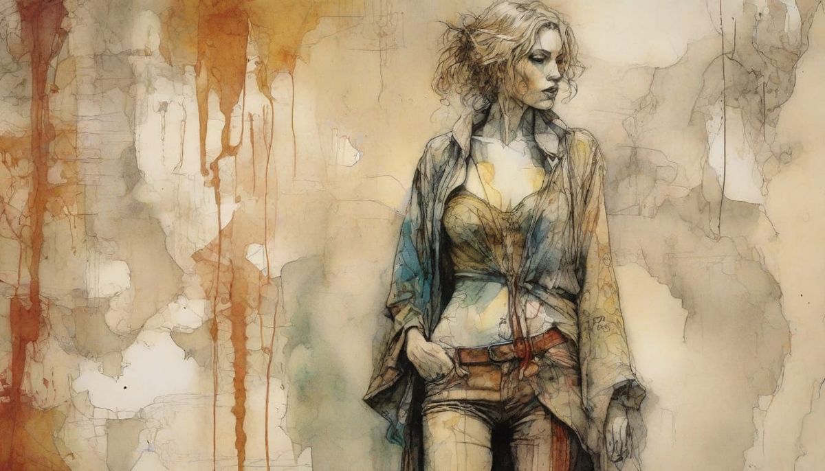 A stunning, stenciled portrait of a woman with a bold, colorful background, showcasing her decolletage and rock-punk style in a warm, ethereal triadic color palette.