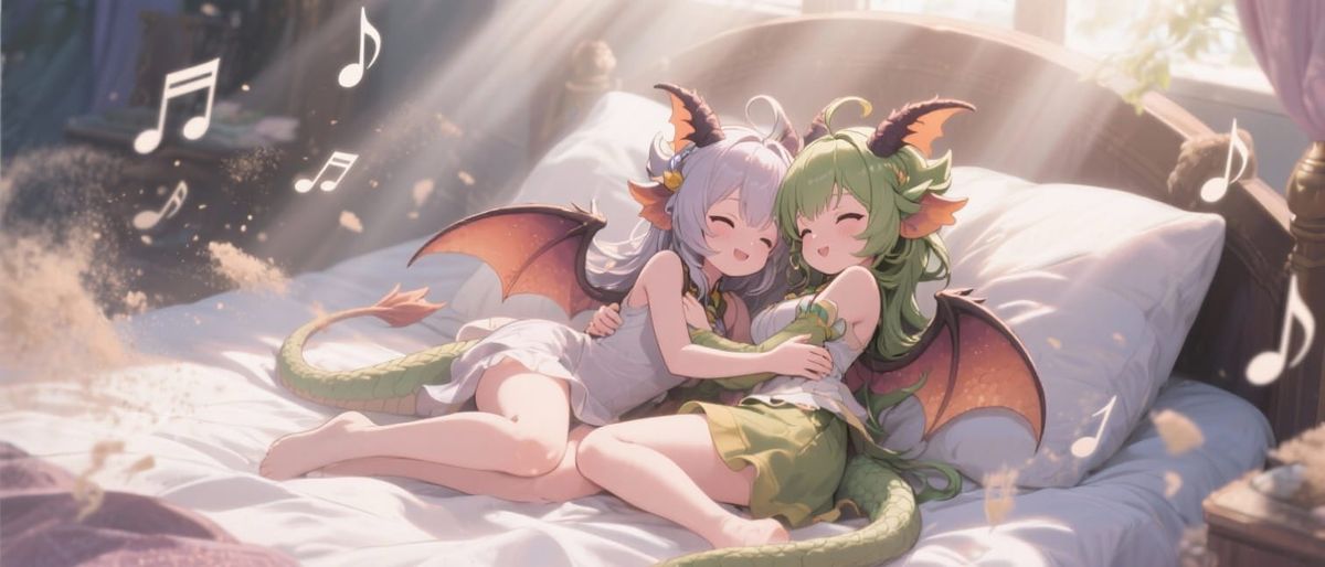 This image shows cute, anthropomorphic dragon girls relaxing in a loving embrace on a bed. Soft, natural lighting and god rays create a cozy, high-resolution fantasy anime key visual.