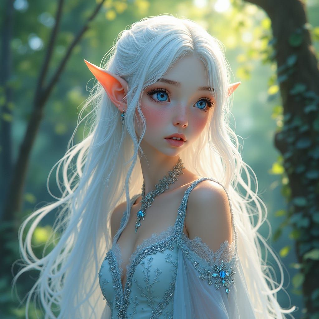 This image shows a beautiful young elf with white hair and blue eyes, dressed in shimmering silver and crystal attire, set against a vibrant forest backdrop with warm sunlight filtering through the leaves, in a dreamy, ethereal watercolor style