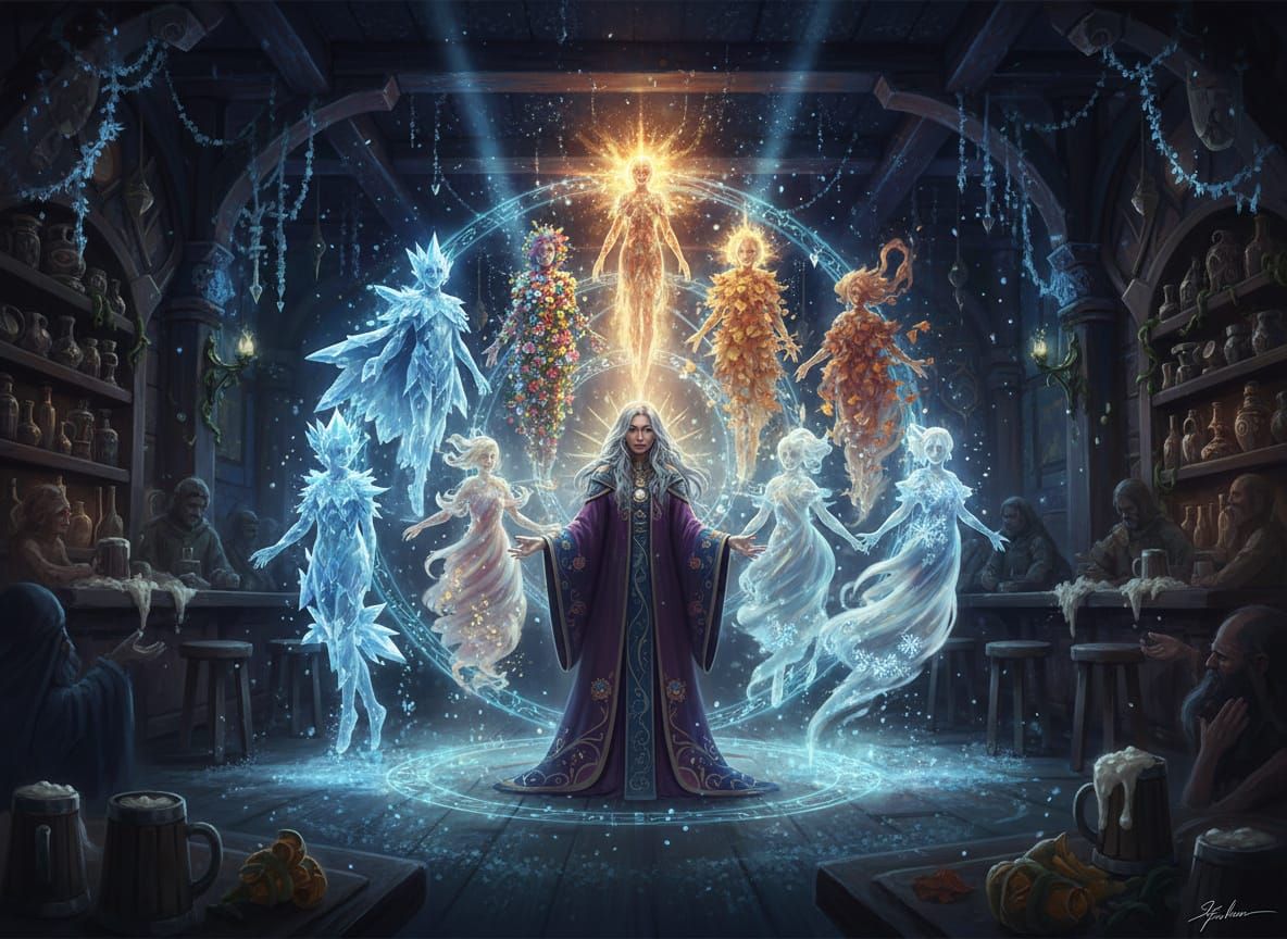 A magical tavern at midnight with a woman surrounded by twelve seasonal spirits. Features cinematic fantasy lighting and a detailed digital painting aesthetic, evoking a fairy-tale atmosphere.