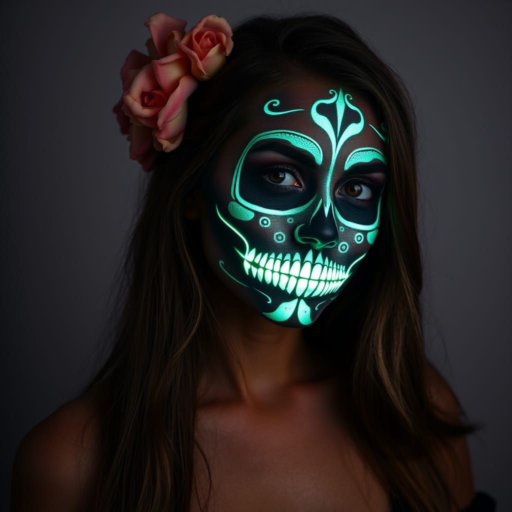 This image features a young woman with striking Halloween makeup that creates a luminescent skull effect on her face. The design is intricate and eye-catching.