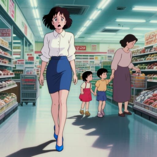 This image depicts a young woman with a scared expression in a 1990s anime style. She walks forward in a department store, with a mother and children shopping in the background under dramatic lighting.