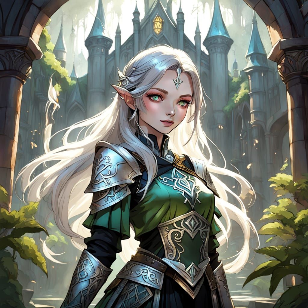 This image depicts a regal young woman with silver eyes and pale skin, surrounded by the mystical atmosphere of the kingdom of Tyara. Soft, flowing silver hair and intricate runes on her hands evoke a sense of healing magic and wonder.
