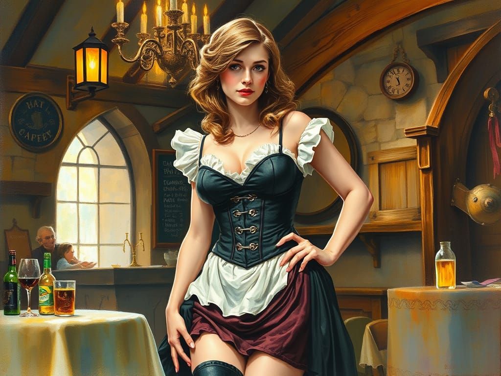This image depicts a tavern maid in revealing medieval attire. The artwork evokes pin-up art through mixed media, with oil paint and watercolor techniques creating a classic aesthetic.