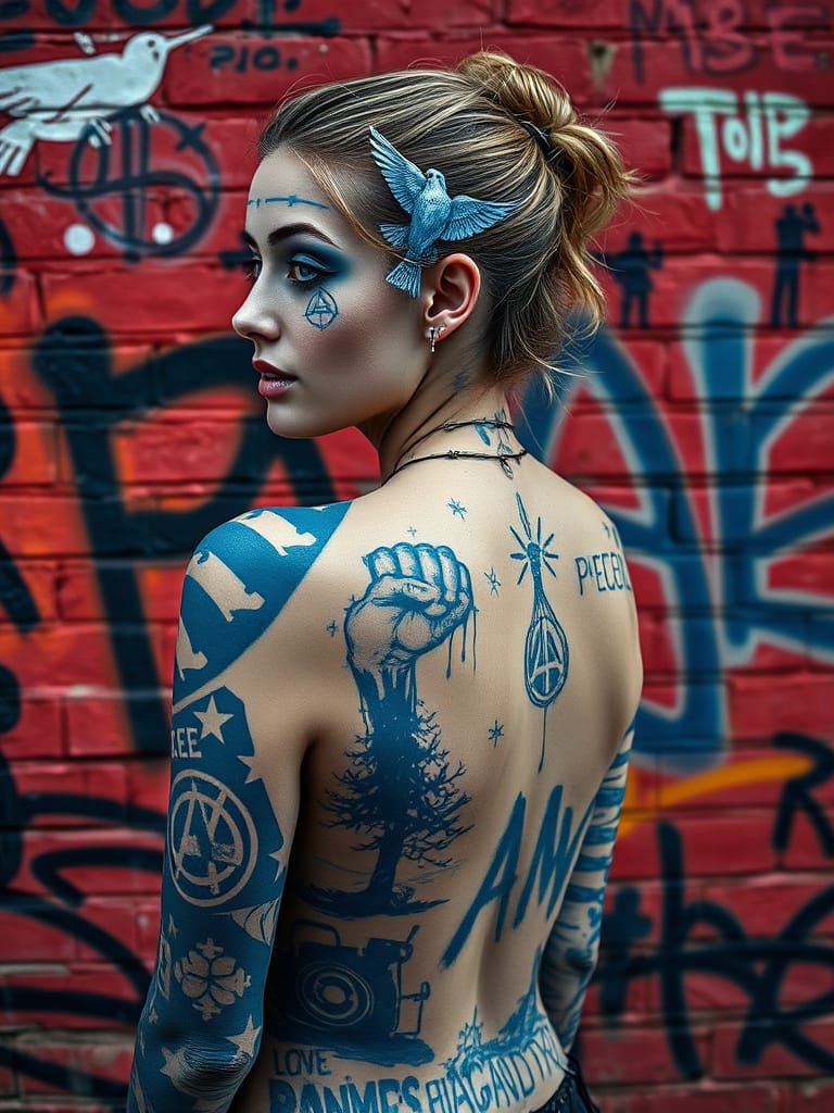 A gritty, photorealistic portrait of a gorgeous young woman whose skin is a canvas of vibrant graffiti tattoos and stencils, embodying an urban art piece.