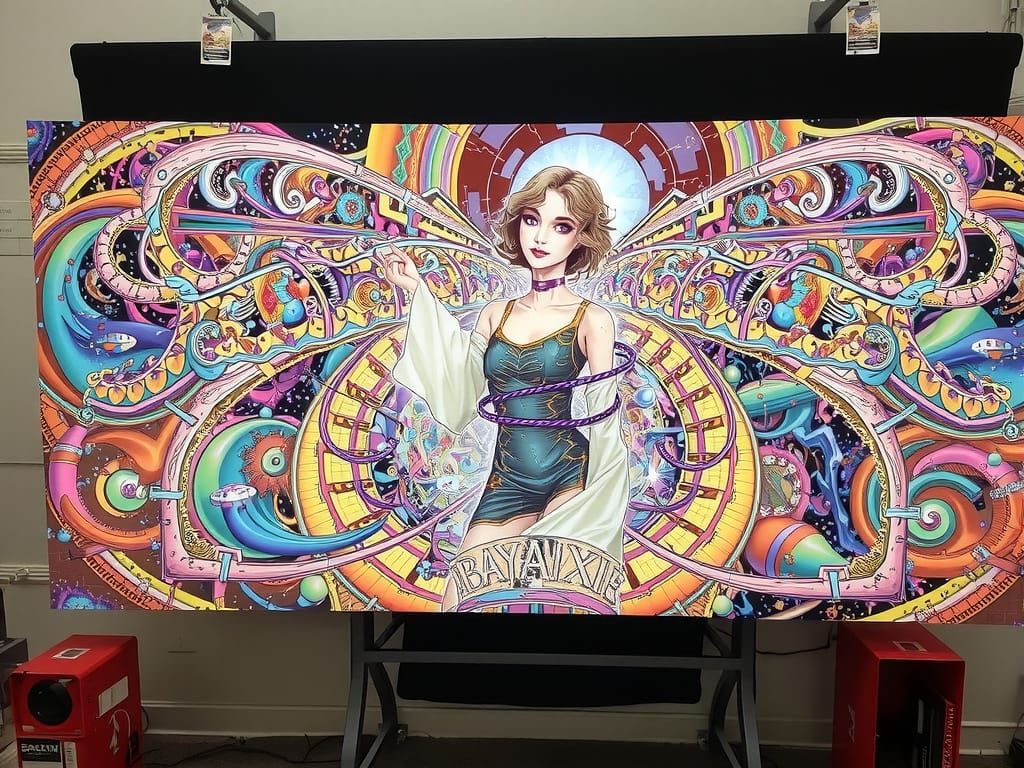 A woman is immersed in a dreamlike, surreal landscape filled with vibrant, swirling neon lights and colors, blending sci-fi, fantasy, and abstract art styles.