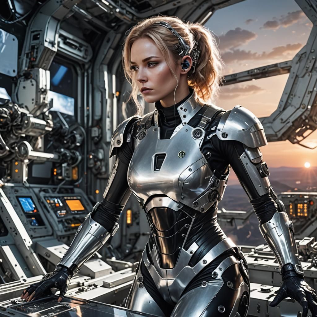 A striking picture of an android woman working in a sci-fi space station laboratory at sunset. The android is a cyborg with silver and black latex and lightning metal.