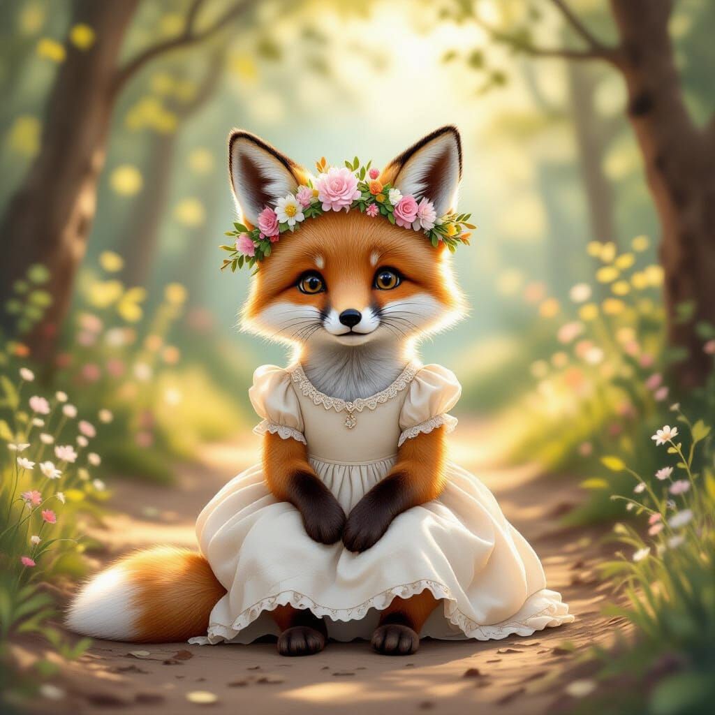 A heartwarming image of a baby fox in a dress and floral crown sitting on a forest path. The scene has golden light and misty trees in a watercolor style.