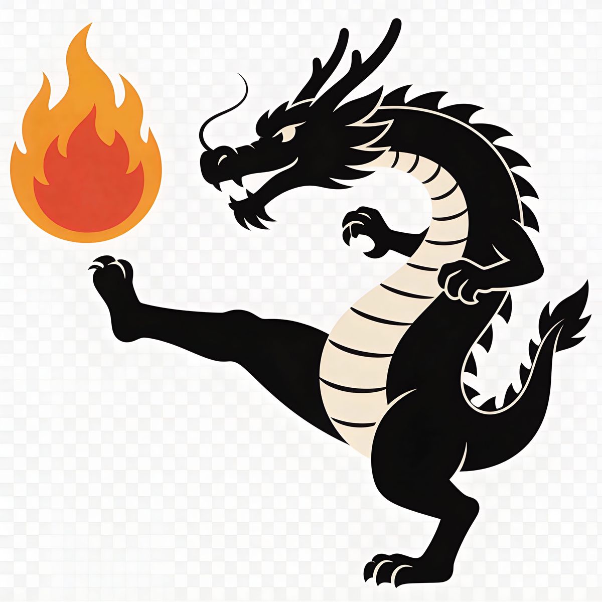 This image shows a whimsical dragon playfully kicking a flaming ball, created in a clean, flat vector illustration style inspired by street art stencils.