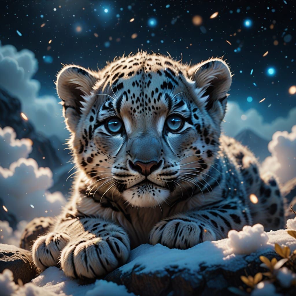 This image shows a fluffy snow leopard cub peacefully sleeping while hugging a glowing Earth. The background is filled with twinkling stars, creating a dreamy night atmosphere in a photorealistic fantasy style.