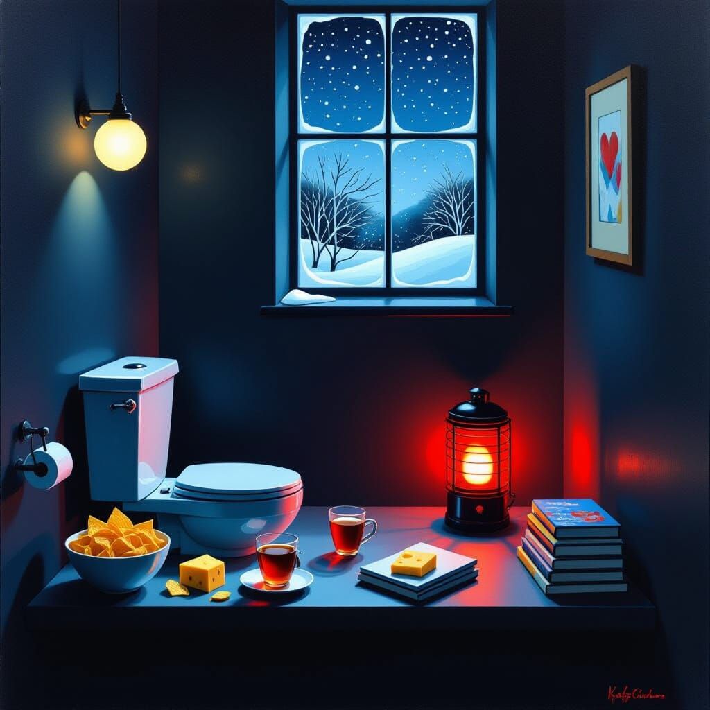 This image depicts a dark, abstract bathroom scene illuminated by a heater's red glow and soft blue light from a snowy window. Detailed elements and dynamic lighting create a moody atmosphere.