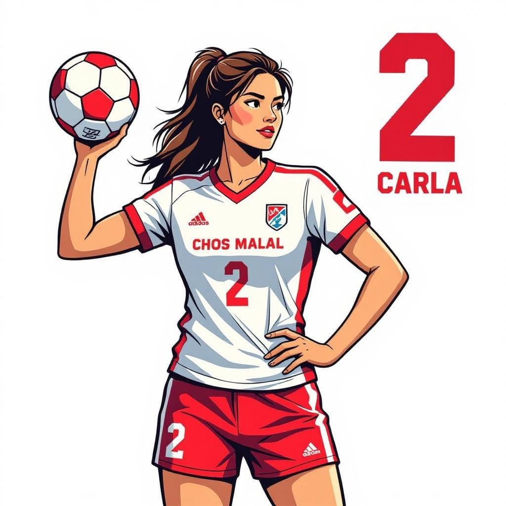 This image features a dynamic handball player in a sporty, stylized design inspired by renowned artists, wearing a jersey and short with bold colors and custom text.
