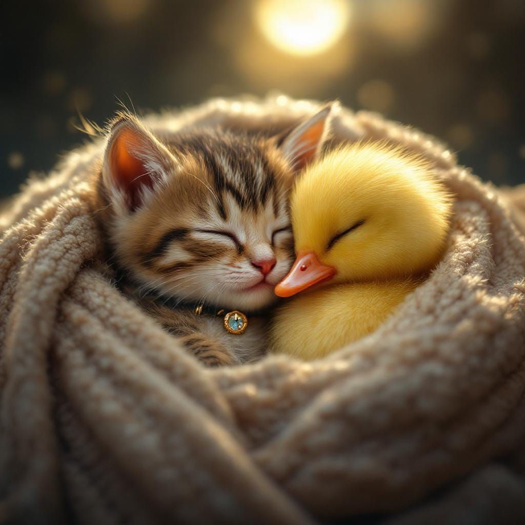 A heartwarming image of a kitten and duckling napping together under moonlight. The pair are captured with intricate detail and high contrast in a photorealistic style.