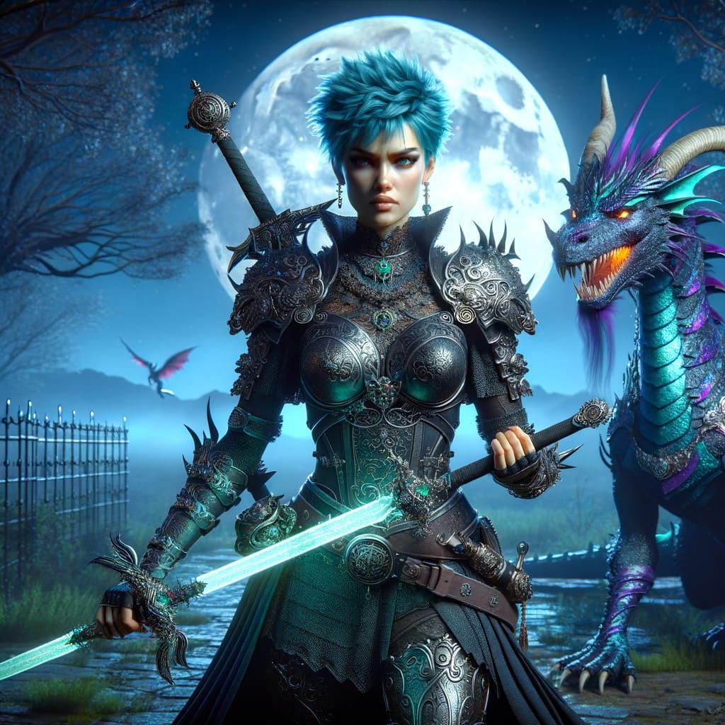 This image shows a strong female warrior with turquoise hair standing in a moonlit forest clearing. A purple and turquoise dragon stands beside her. She holds a glowing sword in this 8k digital rendering.