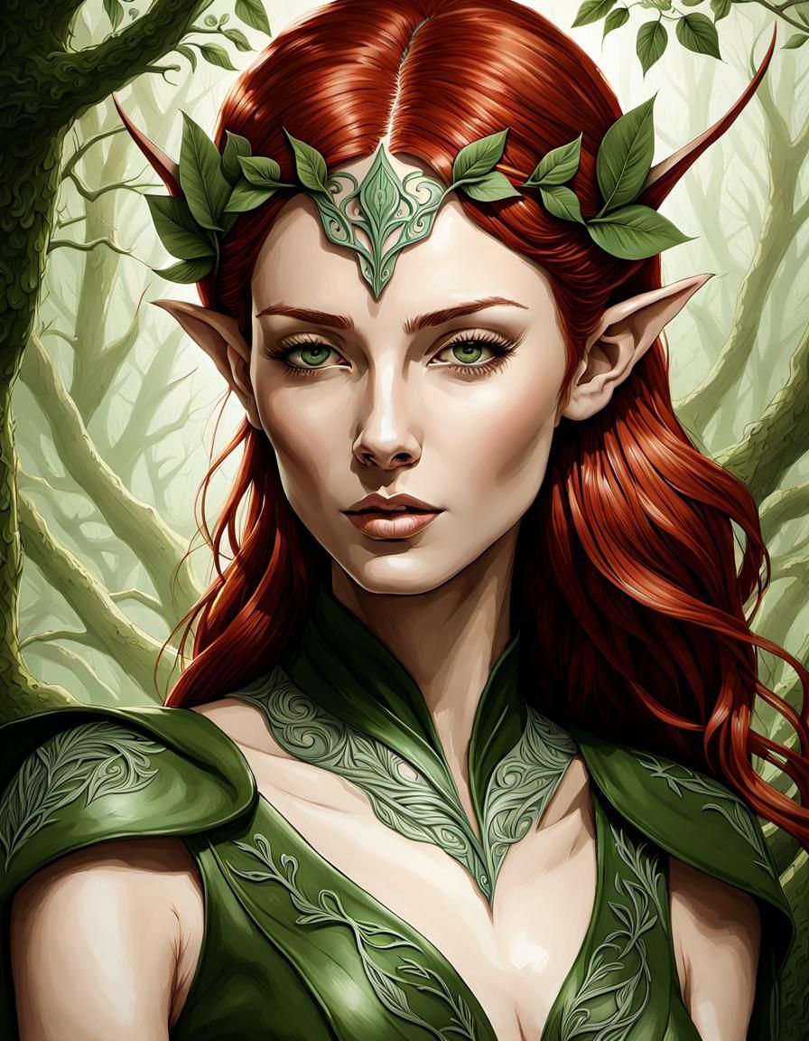 This image shows a pen and ink drawing of a wood elf. The portrait captures the elf's serene expression and intricate elvish runes, with dynamic lighting and a touch of forest green.