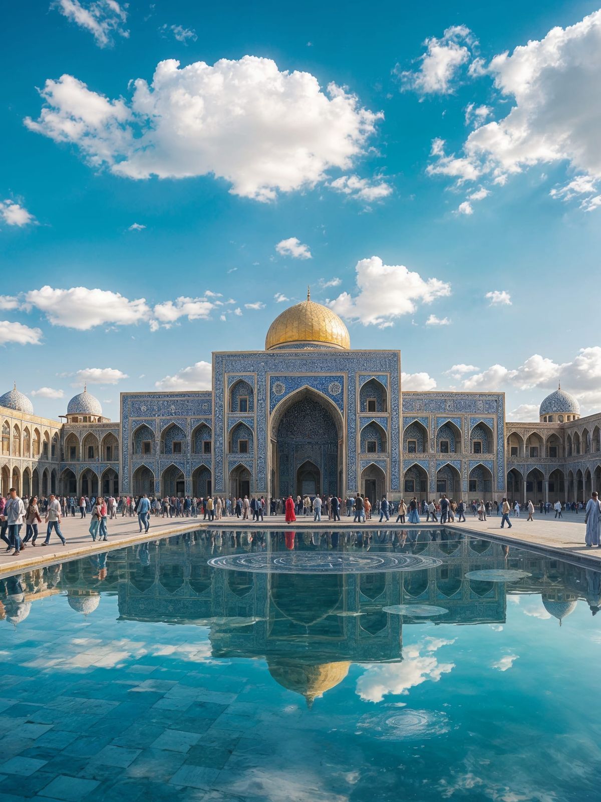 This image shows a vibrant digital rendering of Isfahan's Naqsh-e Jahan Square. The square features blue tiles, a partly cloudy sky, and a large reflecting pool.