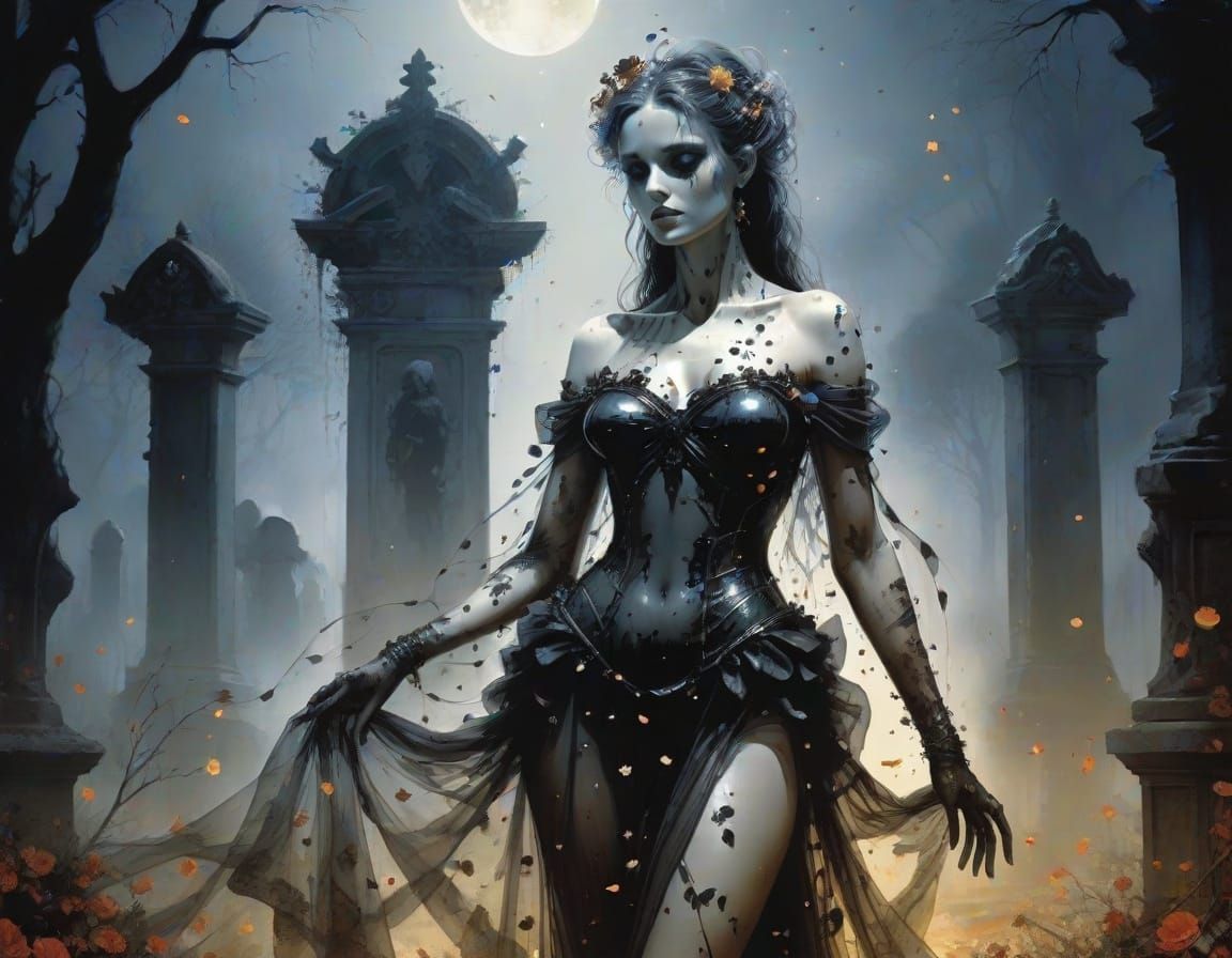 This image shows a close-up of a woman inspired by Venus, dressed in a flowing gown made of delicate petals, standing amidst a dark and mysterious graveyard with a decaying garden at night.