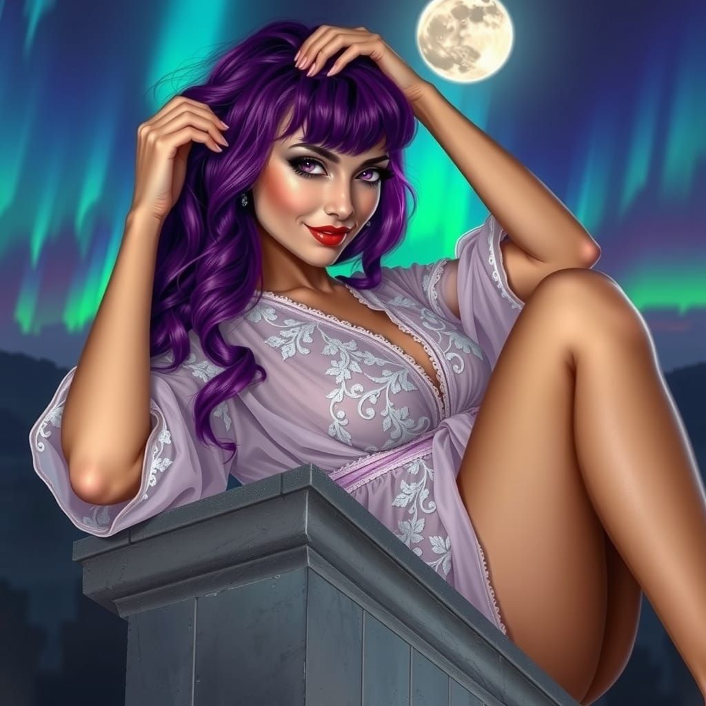 This image depicts a woman in a gothic-inspired lace robe, lounging on a stone altar amidst a vibrant nighttime aurora and full moon, with a mischievous smile and smooth skin, in an ultra-photorealistic style reminiscent of dramatic lighting and colorful art