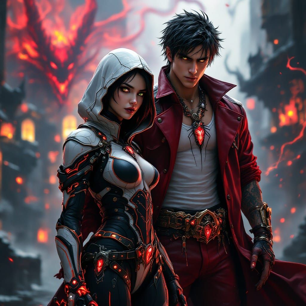 This striking image features a heroic Lady Demon Hunter, clad in an intricately crafted white and black exosuit, standing alongside Dante in a dark, immersive cityscape filled with hellish demons and rich colors, reminiscent of fantasy concept art and dark fantasy landscapes.