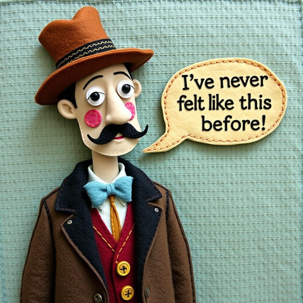This image shows a man in a vintage felt suit and hat, accompanied by a felt speech bubble. The whimsical felt art style features intricate textures and vibrant colors, creating a playful aesthetic.