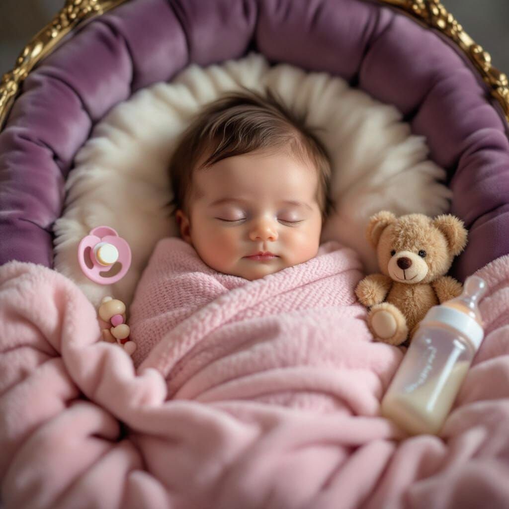 This photorealistic image captures a peaceful newborn baby girl sleeping soundly in a pink blanket within a purple bassinet, surrounded by baby essentials. Soft, warm lighting enhances the delicate details.